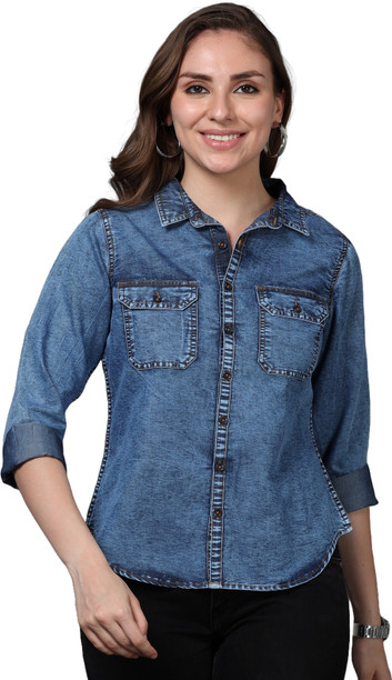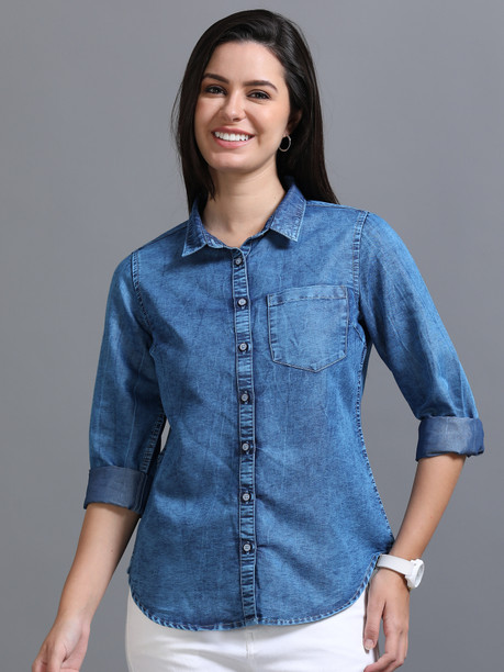 Women Regular Fit Washed Spread Collar Casual Shirt
