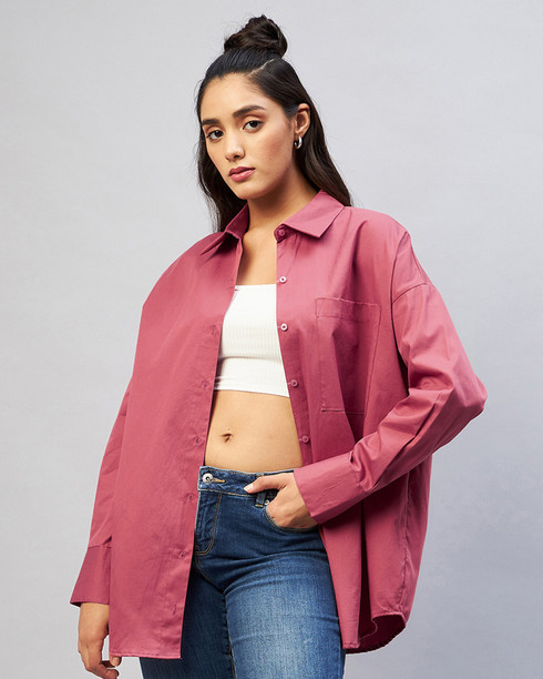 Women Oversized Fit Solid Spread Collar Casual Shirt