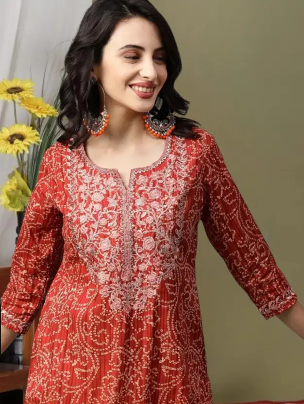 Women Printed, Embroidered Viscose Rayon Straight Kurta (Red)