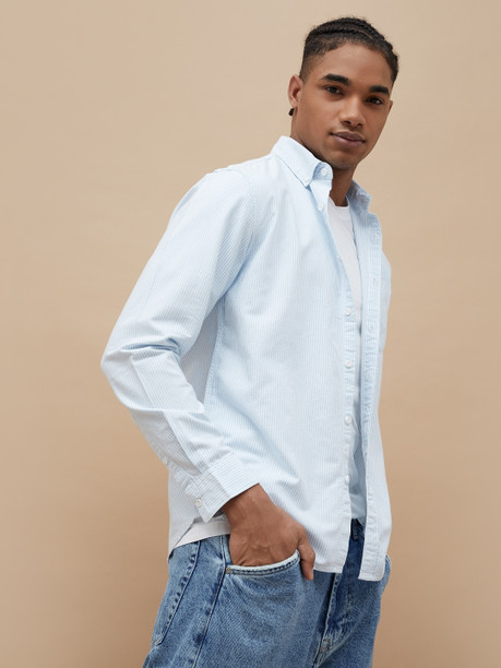Men Slim Fit Striped Cut Away Collar Casual Shirt
