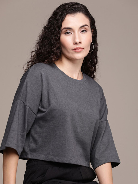 Women Solid Round Neck Cotton Blend Grey T-Shirt