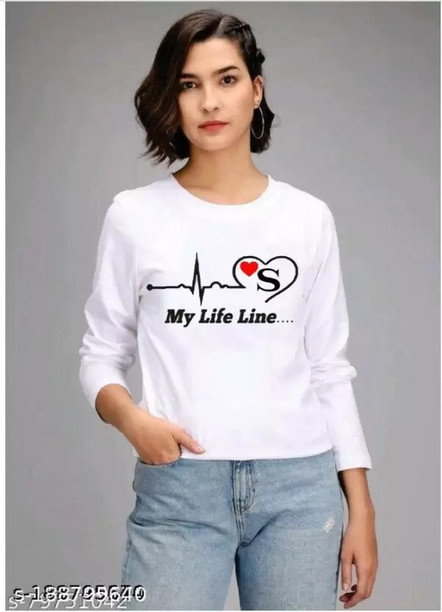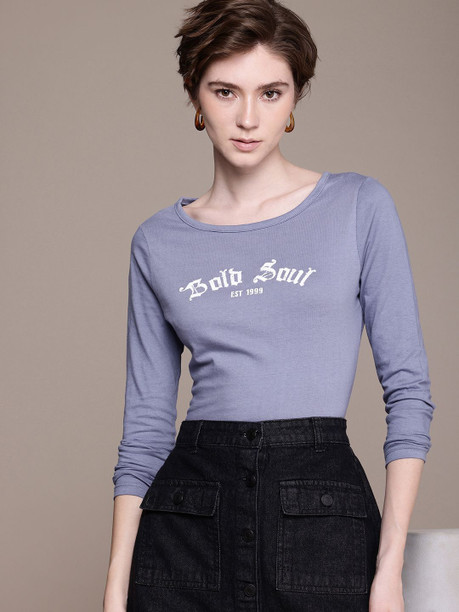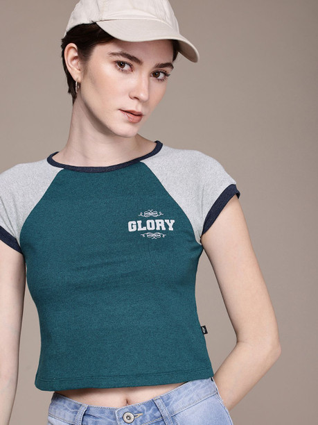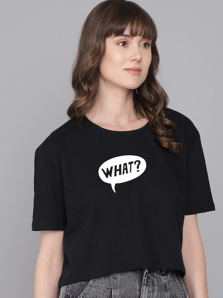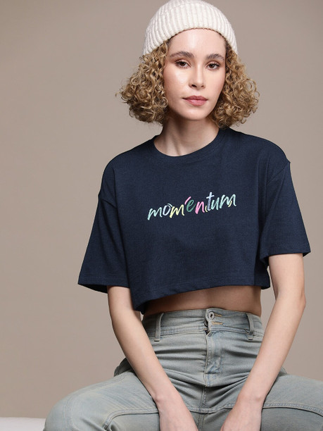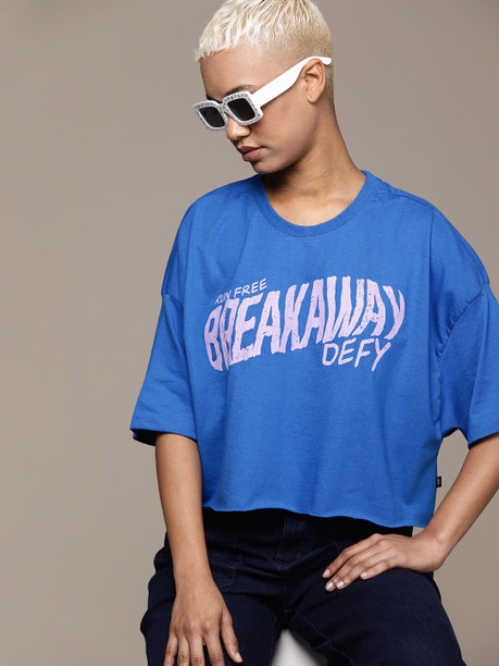Women Printed, Typography Round Neck Cotton Blend Blue ...