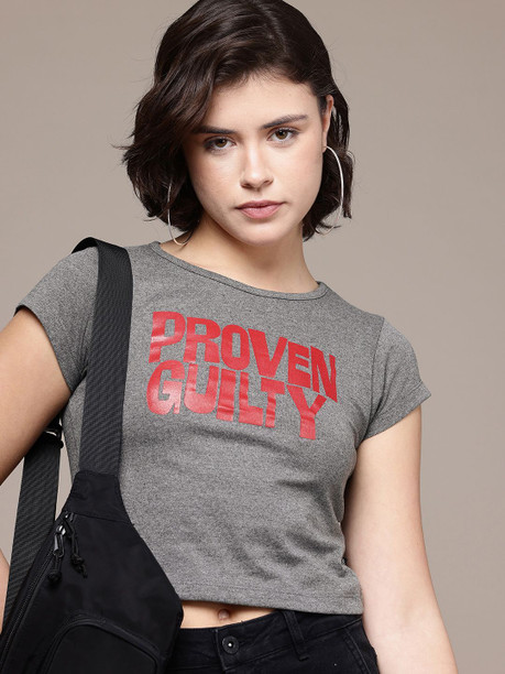 Women Printed Round Neck Cotton Blend Grey T-Shirt