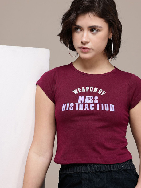 Women Printed Round Neck Cotton Blend Maroon T-Shirt