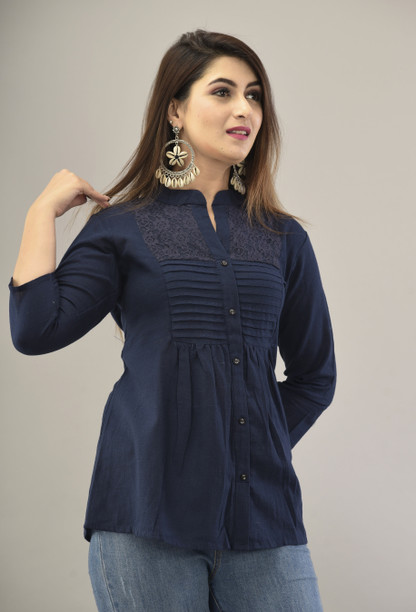 Women Regular Fit Solid Cut Away Collar Casual Shirt